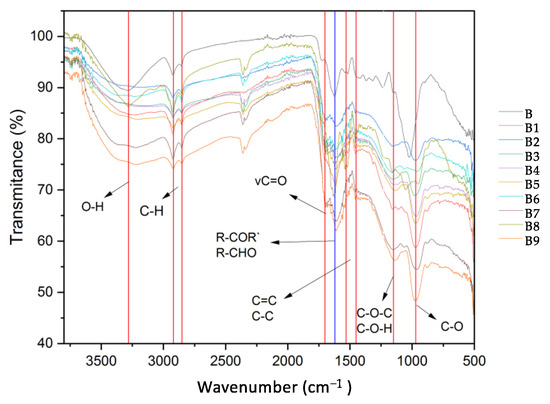 The FTIR absorbance spectrum acts as a structural fingerprint, revealing the optical responses of surface functional groups and offering valuable insights into the chemical characteristics of materials. Furthermore, the positive or negative charge of the biochar surface was determined by the randomly oriented polyaromatic clusters and heteroatomic functional groups that were observed on its surface [41]. Figure 1 shows the FTIR spectra of the biochar synthesized in this study. The band observed at 3280 cm−1 corresponds to hydroxyl groups (–OH). Notably, the intensity of this band is higher for the unmodified biochar (B, see Figure 1) compared to the modified biochar. The bands between 2920 and 2850 cm−1 are attributed to the stretching vibrations of C–H bonds in both sp2 and sp3 configurations. Bands in the range of 2400–2300 cm−1 represent characteristic overtones of unsaturated conjugated or disubstituted carbon bonds, which are typical of biochar materials [42,43]. When comparing the FTIR spectrum of the modified biochar to that of the unmodified biochar, a shift is observed in the band around 1200 cm−1 for the unmodified biochar, which moves to 970 cm−1 in the modified biochar. This shift is likely due to the introduction of oxygenated functional groups, such as carboxyl (–COOH), on the biochar surface. Additionally, the band at 1150 cm−1 shows increased intensity, which can be attributed to the formation of ester (C–O–C) bonds [44].