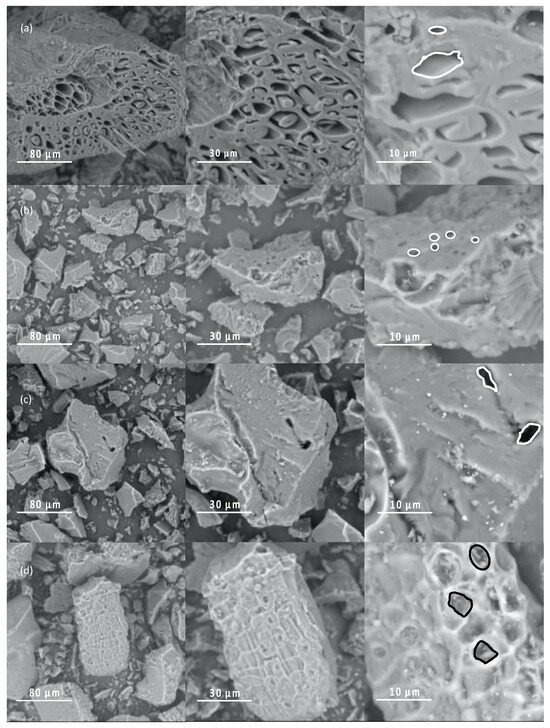 SEM images at various magnifications of biochar synthesized in this study: (a) B1, (b) B3, (c) B6, and (d) B9. (Inside figure pore differences between samples is highlighted).