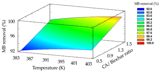 Effect of activation temperature and CA/biochar ratio parameters on removal efficiency of MB. Data are plotted according to information in Table 1 (MB concentration = 10 mg L−1; biochar dosage = 0.100 g; stirring rate = 400 rpm; pH = 9).