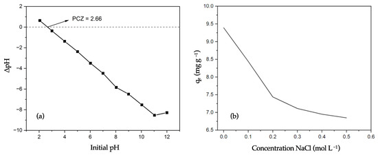 (a) PZC estimation for biochar B9 (1.0 g of biochar in 50 mL of 0.01 M NaCl solution at 298 K). (b) IS effect on the qe value for MB removal using biochar B9 (MB concentration = 10 mg L−1; biochar dosage = 0.100 g; stirring rate = 400 rpm; pH = 9; temperature = 298 K).