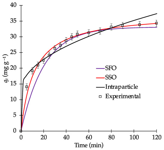 Kinetic fitting for MB adsorption on biochar B9 (biochar loading = 0.100 g; [MB] = 40 mg L−1; pH = 9, temperature = 298 K; stirring rate = 400 rpm).