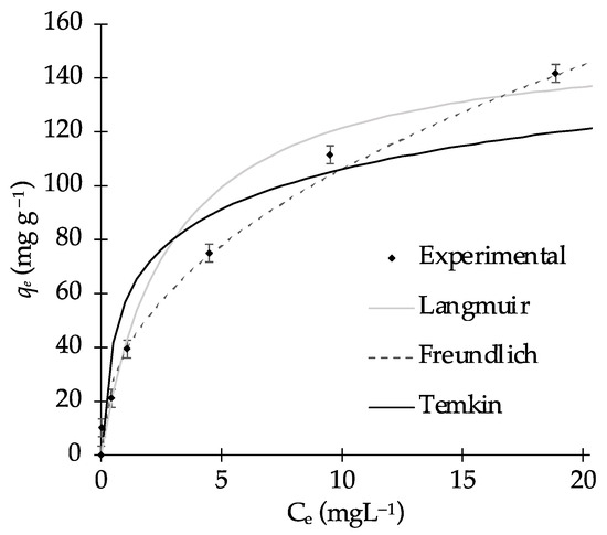 To analyze the isothermal results, three adsorption models were employed: (i) the Langmuir isotherm, (ii) the Freundlich isotherm, and (iii) the Temkin isotherms models, according to [62,63]:
