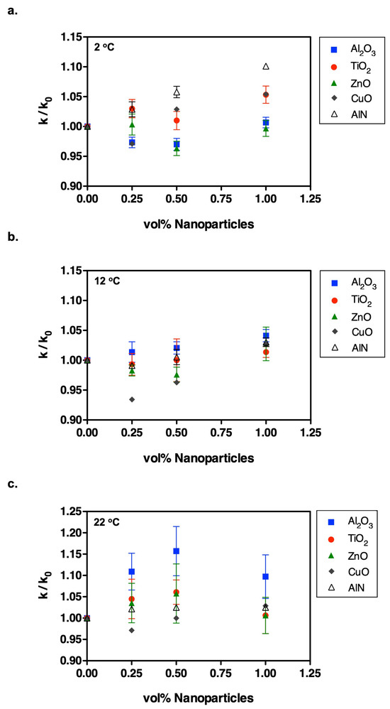 We performed a series of transient hot wire measurements on the suspensions containing TiO2, Al2O3, ZnO, CuO, and AlN nanoparticles at temperatures of 2 °C, 12 °C, and 22 °C to assess the influence of the nanoparticles on the thermal conductivity properties of HFE-7500. Figure 1 compares the thermal conductivity values of all nanoparticles with respect to particle concentration at each temperature. Moreover, Figure 2b, Figure 3b, Figure 4b, Figure 5b and Figure 6b provide thermal conductivity data specific to the corresponding nanoparticle as a function of temperature.