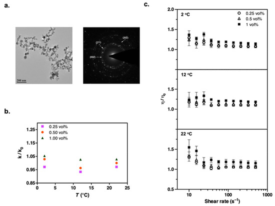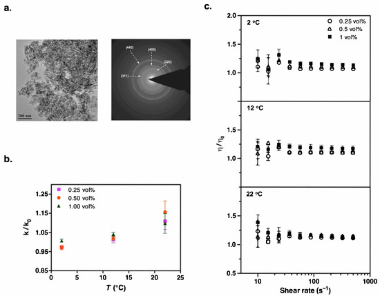 (a) TEM image and the corresponding electron diffraction pattern of Al2O3 nanoparticles used to formulate the suspensions. (b) Temperature dependence of thermal conductivity enhancement in refrigerant suspensions containing Al2O3 nanoparticles, with data expressed relative to the particle-free case, k/k0. (c) Steady shear viscosity measurements show a slight increase at low shear rates. Data shown are obtained over a shear rate sweep from 500 to 10 s−1 after first ramping up from 10 to 500 s−1 to generate reproducible initial conditions. Results are plotted relative to the particle-free case, η/η0. Experiments were carried out at constant temperatures (2 °C, 12 °C, and 22 °C). All refrigerant solutions contained 1 vol% Krytox 157-FSL.