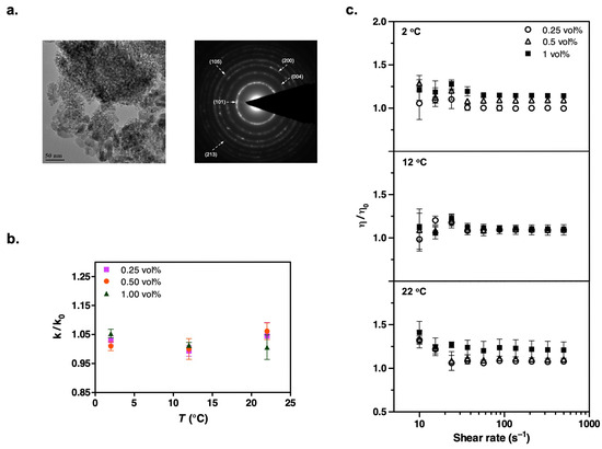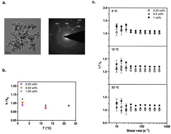 (a) TEM image and the corresponding electron diffraction pattern of dry ZnO nanoparticles. (b) Thermal conductivity of suspensions shows appreciable enhancement only at high temperatures. (c) A similar viscosity enhancement trend is observed in steady shear measurements. The experimental conditions are the same as those in the Al2O3 measurements.