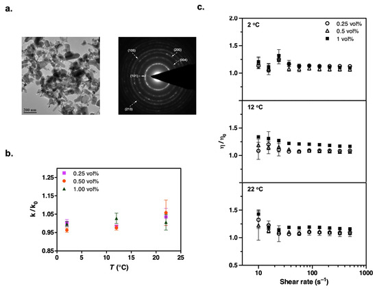 After observing changes in thermal conductivity with the addition of nanoparticles, we measured the steady shear viscosities of the suspensions over shear rates ranging from 500 to 10 s−1. Despite its polymeric chemical structure, the addition of surfactant did not significantly increase the refrigerant viscosity (Table S2 in Supporting Information). We focused on low percentage loadings of nanoparticles in the refrigerant to avoid excessive viscosity enhancement, which could adversely affect fluid properties and hinder practical applications [49,50,51]. Our results showed that the relative viscosity of all the nanorefrigerants, defined as the ratio of the nanofluid viscosity (μ) to the viscosity of the particle-free pure refrigerant (HFE-7500), gradually increased with the volume fraction of nanoparticles (Figure 2c, Figure 3c, Figure 4c, Figure 5c and Figure 6c). This increasing trend was most evident at high shear rates. The fluctuating viscosity values at low shear rates might have been due to the strengthened interparticle interactions at higher concentrations. Interestingly, we observed similar behavior at low shear rates for pure refrigerant as well. Therefore, we believe that these effects are diminished when ratios are considered, but there could still be an unavoidable impact on the measurements.
