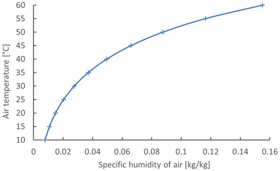 Empirically derived equations can be used in the design of a packed bed heat exchanger [4]. Another possibility is to use the analogy between heat and mass transfers derived from the mass transfer during evaporation of water vapour into air for the calculation of heat transfer [15,18,19,20]. However, these calculation procedures do not take into account the heating of the gas itself, which is part of the process and can be expected to have a significantly lower intensity of heat transfer. The amount of water vapour absorbed when the air reaches a state of water vapour saturation does not have a linear dependence on its temperature (Figure 1). At higher air temperature, the same change in the specific humidity corresponds to a smaller change in air temperature. Therefore, as the temperature changes, the ratio of heat for heating the air and evaporating water vapour also changes.