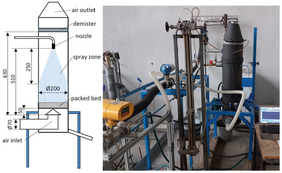 The flow rate and pressure of water in the spray nozzle were kept constant for all measurements. For these conditions, the experimentally determined droplet size was expressed using the Sauter diameter as 0.280 mm. The flow velocity of the spray droplets at the nozzle orifice is 13.2 m/s. Glass Raschig rings with a diameter of 10 mm and a specific surface area of 440 m2/m3 were used in the experiments.