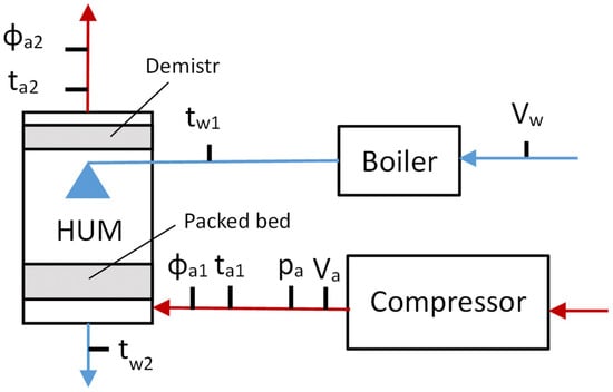 A diagram of the experimental setup is shown in Figure 3. Air is supplied from a compressor with a large air tank to the lower part of the humidifier. Before entering, the air flow rate, pressure, temperature, and relative humidity are measured. In the upper part of the humidifier, there is a water drop separator for the case of drifting. Thermocouples are placed at the inlet and outlet in several places along the cross-section of the exchanger to measure air temperature. Pressure sensors are placed at the air inlet and outlet to determine the pressure loss of the humidifier. However, at such low air speeds, the loss is minimal and reaches maximum values up to 10 Pa. Water used for showering is heated in an electric boiler to the required temperature before entering the heat exchanger (HUM). The cooling water flow rate is measured by a FLONET FN2010.1 induction flowmeter (Elis Pilsen Ltd., Pilsen, Czech Republic) with current output calibrated with a deviation of 0.6%. Calibrated type-T thermocouples to within 0.2 °C are used to measure all temperatures. The air volume flow rate is measured by an IN-ECO PL3 rotameter (IN-ECO Ltd., Ružomberok, Slovakia) with accuracy of ±5%. The air pressure is measured by a U-tube water manometer and the relative humidity is measured with a Testo 400 hygrometer (Testo SE & Co. KGaA, Schwarzwald, Germany). The measured values are recorded at 5 s intervals in the DAS240Bat data logger.