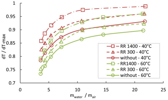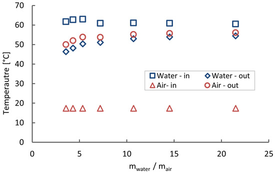 In a comparative series of experiments, measurements were made with identical parameter settings, with the only difference being the inlet temperature of the spray water, which was set to approximately 40 °C to demonstrate the effect of temperature. An overview of the experimental data is presented in Appendix B, Table A1. The relative humidity at the humidifier outlet reached 100% in all measurements. The air therefore always leaves the heat exchanger saturated with moisture to the maximum possible level. For all measurements, the heat balance of the heat exchanger was checked by comparing the heat transfer rater on the water and air side; the results of the balances for all measurements are presented in Appendix C, Table A2. Figure 4 shows an example of the temperature distribution in the humidifier depending on the ratio of the mass flow rates of spray water and humidified air for configuration (1).