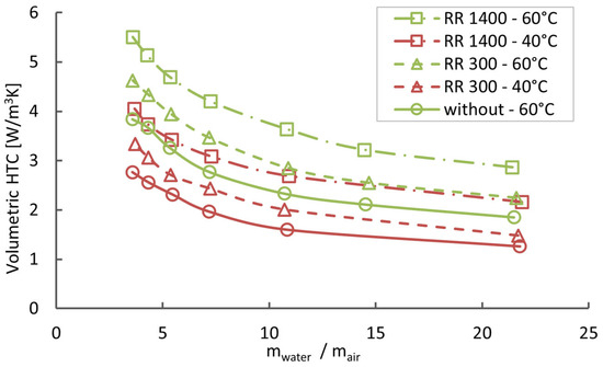 The experimentally determined values of the volumetric HTC as a function of the ratio of the mass flow rates for different water temperatures and different configurations are shown in Figure 6. According to the conclusions of [15], the temperature of the spray water is an essential process parameter. From Figure 6, it can be seen that higher values of the volumetric HTC are achieved at higher spray water temperatures and hence higher outlet air temperature.