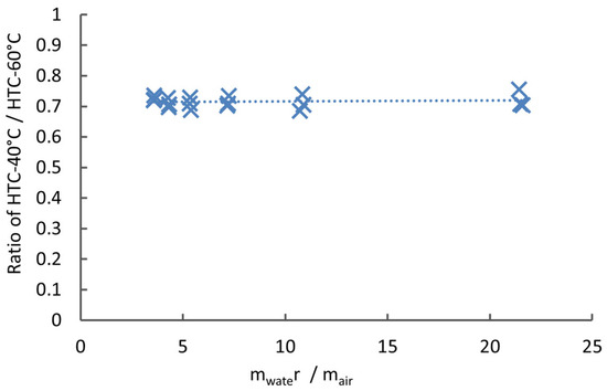 The relative difference between the experiments for spray water temperatures of 40 °C and 60 °C is shown in Figure 7. It can be seen that the ratio of the values of these coefficients is very similar over the entire interval analysed (values in the ratio range 0.7 to 0.8). This indicates that the value of the volumetric HTC is significantly influenced by the temperature of the humidified air. At the same time, knowing the ratio of the values of the volumetric HTCs for two different temperatures at the same ratio of flow rates, it is thus possible to recalculate the value of the volumetric HTC from one temperature to the other temperature for any value of the flow rates.