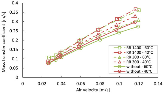 Figure 8 shows the dependence of the mass transfer coefficient of water vapour evaporation in the humidifier on the air flow velocity for different spray water temperatures and configurations. The values of the mass transfer coefficient increase with the packed bed layer size but, on the contrary, are not significantly affected by the humidified air temperature.
