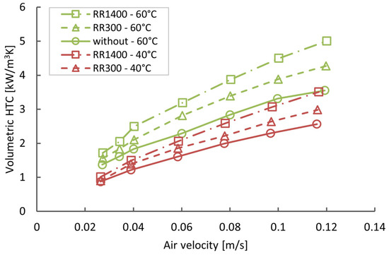 In Figure 9, the dependence of the volumetric HTC on the air flow velocity is shown. The use of a packed bed significantly increases the volumetric HTC values and thus the heat output. So it is possible to achieve a smaller heat exchanger size for the same heat output.