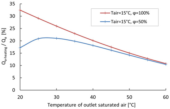 In accordance with the findings of [16], the whole process is also influenced by the saturation of the incoming air (its relative humidity), where the dew point temperature of the air drawn in from the surroundings is therefore lower than its temperature. Thus, in the initial phase of the process, only the saturation of the air with water vapour occurs without a change in its temperature, which will increase the amount of heat used for evaporation of the water vapour and thus the total amount of heat. As a result, the ratio of heat used for heating to total heat used is reduced.