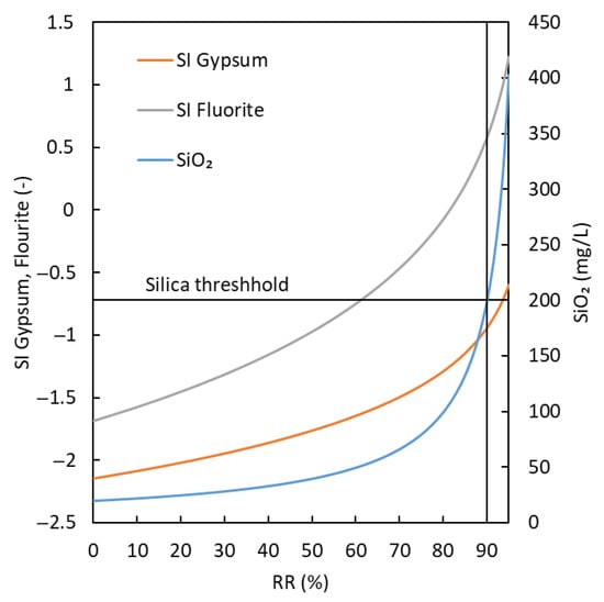 Simulation of the passage of the NF accumulated permeate (PA) through an RO step (up to RR = 95%), assuming full rejection of all dissolved species. The SI for gypsum and fluorite is shown, along with the total silica concentration. The horizontal line shows the maximal silica concentration threshold with the use of AS.