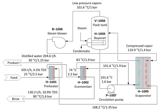 The combined BW desalination NF+2xRO membrane scheme described thus far would reach a recovery of 87.4% of the BW feed flow. To increase the recovery to >95%, a mechanical vapor recompression evaporation (MVR) was simulated on the mix of the retentates from the NF and 2nd RO stages. Combined, this stream had an average TDS of ~4.5% wt., which is higher than seawater but certainly common as feed or the circulation of industrial wastewater evaporation or BW advanced recovery stages [,]. Figure 3 shows a schematic general design for the MVR evaporation stage, planned for recovering 204.6 t/h of product water, to elevate the recovery of a 20 Mm3/y (2670 m3/h at 90% operability) BW desalination plant to >95% (i.e., 2537 m3/h product water). The main MVR equipment characteristics are shown in the Supplementary Material.