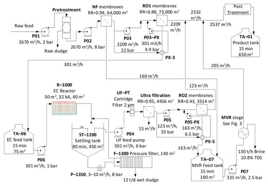 The suggested process scheme, with its relevant flow rates, RR values, and main equipment characteristic sizes, is presented in Figure 4. RO1 and RO2 in Figure 4 are the 1st and the 2nd reverse osmosis applied steps.