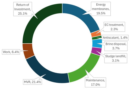 To enable an incremental cost estimation, the CAPEX was calculated separately for the membranes and the MVR sections of the proposed plant. Thus, the equipment estimation of the membranes section was factored as 23% of the total membrane CAPEX [], while the key equipment of the MVR section, which included costly high-alloy heat exchangers and expensive machinery, was factored as 40% of the total MVR CAPEX. The specific CAPEX in USD /m3 was calculated with an interest of 4.375% [] for 30 years []. However, utility projects in the US may receive discounted rates of about 2.5% or even as low as 1.6% interest rate for long term projects in eligible municipalities [], which may reduce the total product cost (CAPEX + OPEX) by 4–5%.