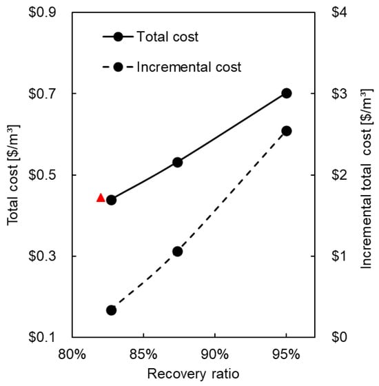 Table 10 and Figure 6 summarize the OPEX and CAPEX of the operational options (recovery ratios) and the incremental total cost for the proposed plant’s three operational options (as well as for the Ma’agan Michael reference plant). The red triangle in Figure 6 stands for the normalized total cost of the Ma’agan Michael reference plant. The actual brine disposal solution and its associated costs have a critical role in the difference between the three operational options. For example, an offsite brine injection, carried out with tankers that may cost at least USD 3.5/m3 [], will render the full ZLD option the most economic, with a total normalized cost of USD 0.846/m3 versus 1.013 and 1.095 USD /m3 in the baseline operation and the Ma’agan Michael reference case, respectively.