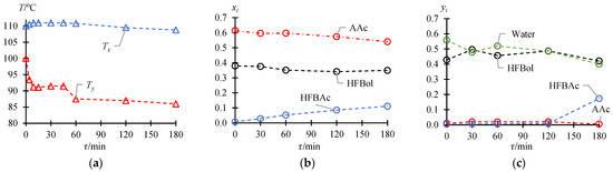 The BRD process was conducted at atmospheric pressure in total reflux mode. A binary mixture of HFBol and AAc, with the acid catalyst injected into the bottom of the column (Figure 1), was heated to bring the column to operating mode. The operating mode of the column implies the presence of counter-flow of vapor and liquid, formed at the bottom during heating and flowing from the condenser, respectively. Thus, the moment when the column reaches operating mode corresponds to the appearance of reflux (τ = 0). The feed composition is shown in Table 2, and the experimental results are presented in Table 3 and Figure 2.