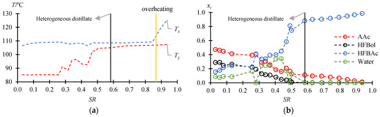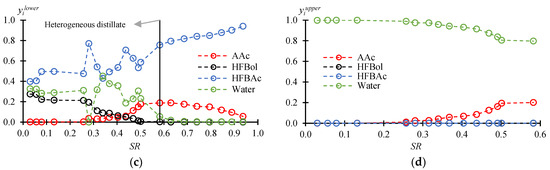 At SR > 0.5824, the distillate becomes homogeneous, and HFBol is virtually absent in the system (in trace amounts). There is also almost no water in the system. This indicates that the BRD process has been completed, and the distillation of the mixture in fractionation mode was proceeding. Thus, after the distillate has become homogeneous, catalyst removal can be achieved through standard procedures, such as distillation of the product without reflux or simple filtration. The analysis of the distillation process in fractionation mode (Figure 3, SR from 0.5824 to 0.9369) shows that HFBAc is concentrated at the bottom of the column. The maximum purity of HFBAc in the fractions (bottom of the column) is more than 99.6 wt. %. (98.51 mole % of HFBAc, 1.21 mole % Aac, and traces of water and HFBol).
