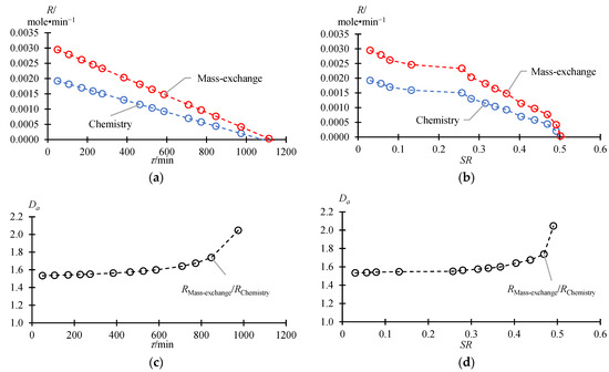 For the BRD process, the Damköhler numbers () were calculated (Equation (3)). The parameter is the dimensionless number used in chemical engineering to relate the mass exchange rate to the chemical reaction rate.