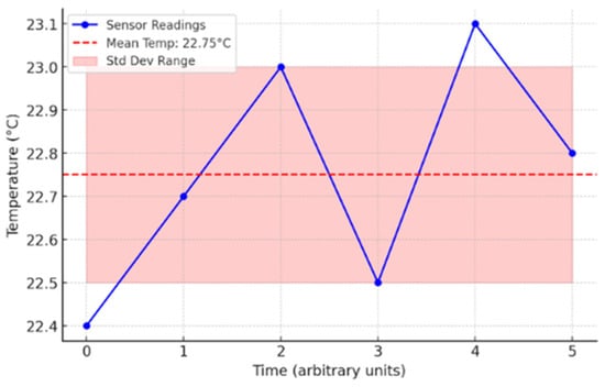 The data was organized and analyzed using High-Performance Numerical Operations (NumPy). Figure 1 shows the analysis of IIoT sensor data using NumPy. The blue line with markers represents the sensor readings over time, while the red dashed line indicates the mean temperature. The shaded red region represents the standard deviation range, helping to visualize normal variations in temperature. This approach allows quick identification of anomalies—any reading significantly outside the shaded region could indicate a potential issue in the system.