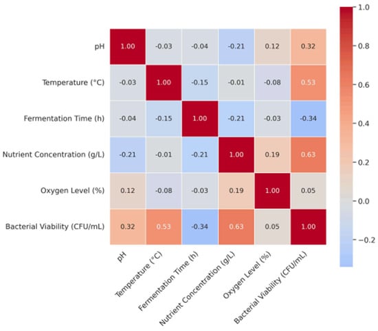 As shown in Figure 1, IIoT sensor data analysis using NumPY and the Matplotlib 3.10.0 and Seaborn 0.13 libraries was conducted to analyze data by generating graphs showing important information in a more understandable way. Figure 2 shows a correlation graphic using Matplotlib and Seaborn libraries to analyze the impact of the most critical variables in the production processes of agricultural seed inoculants. The values in the correlation matrix indicate the strength and direction of the correlation between the variables. A value close to 1 indicates a strong positive correlation, while values close to −1 indicate a negative correlation. This helps to identify which parameters most influence biomass production and the biological activity of the inoculant.