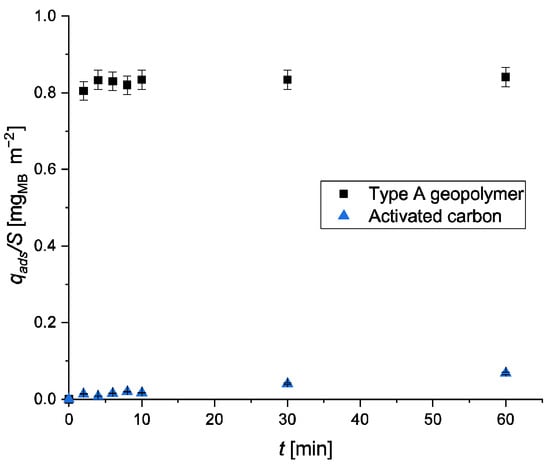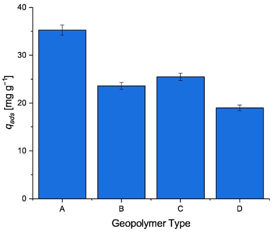 | Maximum adsorption capacity of geopolymers at 30 °C: Type A: 35.3 [mg g−1] Type B: 23.6 [mg g−1] Type C: 25.5 [mg g−1] Type D: 19.0 [mg g−1] |