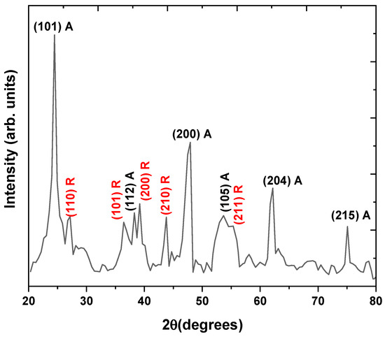 The average crystallite sizes were calculated using the Debye–Scherrer [36] Equation (1), and the average size of the dispersed TiO2 was found to be 12.55 nm.