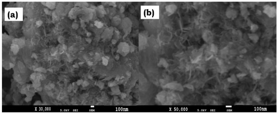 Field-emission scanning electron microscopy (FE-SEM) imaging of Pt@TiO2–GAP revealed the morphology and dispersion of nanoparticles within the gum acacia matrix. At a lower magnification (Figure 4a), agglomerates of particles were discernible, resulting from the interaction between gum acacia (GAP), TiO2, and Pt nanoparticles. A rough, porous texture is advantageous for catalyst supports because it provides an increased surface area for active sites [37]. The non-uniform particle distribution suggests partial agglomeration of TiO2 or Pt nanoparticles, a phenomenon commonly observed in biopolymers such as gum acacia [38]. The web-like features represent the organic residues of gum acacia, which encapsulate TiO2 and Pt. At a higher magnification (Figure 4b), smaller particles and detailed textures became apparent. Pt nanoparticles manifested as bright dots across the TiO2–gum acacia surface. The entangled matrix illustrates the polymeric nature of gum acacia, which stabilizes the TiO2 and Pt particles. The contact between the components indicates efficient electron/charge transfer pathways, which are beneficial for applications in photocatalysis, sensing, and fuel cell supports.