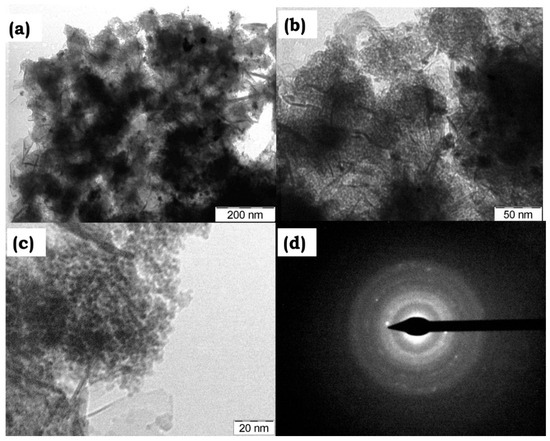 Transmission electron microscopy (TEM) images of Pt@TiO2–GAP, shown in Figure 5a, reveal an irregularly shaped, agglomerated particle network, suggesting strong interactions between TiO2, Pt, and gum acacia. The dark regions likely correspond to dense Pt and TiO2 particles, whereas the lighter regions are associated with the biopolymer matrix.