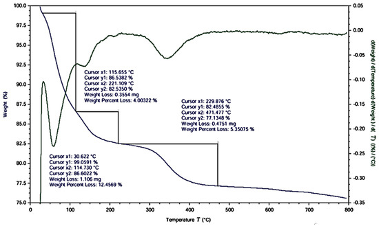 The thermal stability and decomposition characteristics of the nanocomposite were evaluated by thermogravimetric analysis (TGA). A detailed examination of the TGA profiles of Pt@TiO2–GAP composite, conducted under a nitrogen atmosphere at a heating rate of 20 °C/min over a temperature range of 25–1000 °C, revealed distinct thermal behaviours characterized by significant mass loss in successive stages (Figure 6). The thermogram of the Pt@TiO2–GAP composite shows three distinct decomposition steps. The initial weight loss of 12.45% observed between 30 and 115 °C indicates the removal of loosely bound water molecules from the biopolymer framework. The subsequent decomposition steps, accounting for 4.0% between 115 and 220 °C, are attributed to the decomposition of low-molecular-weight organic compounds or weakly bound volatile components in gum acacia, while a 5.3% loss between 230 and 470 °C is associated with the decomposition of the organic matrix (gum acacia) and potential oxidation of the remaining carbonaceous content. No significant weight loss was observed above 500 °C because the remaining material primarily consisted of TiO2 and Pt. The results underscore the hybrid nature of the composite, with contributions from the inorganic metal oxide phase and the organic biopolymer scaffold. The Pt@TiO2–GAP composite demonstrated good thermal stability, with the main decomposition of the organic content occurring below 500 °C. The presence of TiO2 and Pt enhances thermal resistance, rendering it suitable for high-temperature applications such as catalysis.