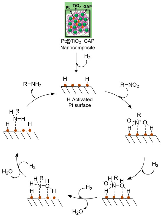 The TiO2 support, consisting of anatase and rutile phases, improves electron mobility and stabilizes Pt nanoparticles, whereas the gum acacia polymer assists in dispersing and stabilizing catalytic sites and enhances substrate binding through hydrogen bonding and π–π interactions. The adsorbed nitroarene undergoes stepwise reduction on the hydrogen-rich Pt surface, transforming –NO2 into a nitroso intermediate (R–NO), then into hydroxylamine (R–NHOH), and, finally, into a primary amine (R–NH2). The presence of surface-bound hydrogen and the stabilization of intermediates allows this sequence to proceed efficiently. The catalytic cycle is completed by desorption of the product and regeneration of the active Pt sites. This mechanistic pathway is supported by the selectivity of the catalyst, high yields across various substrates, and its ability to be recycled over multiple cycles. These findings, along with detailed structural (XPS, FTIR, TEM, and ICP-OES) and spectroscopic analyses, confirm the active role of the Pt species within the TiO2–GAP matrix. The synergy between metallic Pt, the mixed-phase TiO2 support, and the functional biopolymer scaffold enables efficient hydrogen activation and substrate transformation, which is consistent with the established mechanistic frameworks for Pt-catalyzed nitroarene hydrogenation [2,3,36].