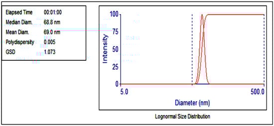 Dynamic Light Scattering (DLS) measures the light scattering intensity to estimate the size of particles in a suspension. From this analysis, the TiO2 NWs loaded with Fe2O3 have an average particle diameter of 69 nm and a geometric standard deviation of 1.07 nm. The analysis provided in Figure 1 shows a Gaussian distribution of particle sizes. The particle size distribution falls within a narrow range of 61.3 nm to 77.3 nm, indicating a highly consistent size distribution for the nanowires. Additionally, the low polydispersity index (PDI) value of 0.005 confirms the high uniformity and mono-dispersity of the particles, signifying a highly homogeneous suspension with very little variation in particle size. This narrow distribution highlights the quality and precision of the synthesized nanowires.