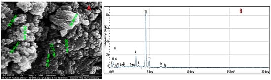 After synthesizing the TiO2 NW-Fe2O3 hybrid nanocomposites, scanning electron microscopy (SEM) was employed to analyze their surface morphology. As shown in Figure 3A, the nanocomposite exhibited a wire-like structure characterized by aggregated nanowires. Due to their small size, individual iron nanoparticles were not distinguishable in the SEM images. Nonetheless, this confirms the successful formation of the nanowire structure, with Fe2O3 likely distributed at the nanoscale.
