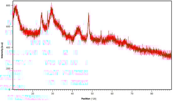 The X-ray diffraction (XRD) analysis provides insights into the crystalline phases and structure of TiO2 NWs loaded with Fe2O3. The XRD pattern, shown in Figure 4, reveals peaks corresponding to both TiO2 and Fe2O3 crystalline phases. The prominent diffraction peaks match well with the anatase phase of TiO2 and the rhombohedral hematite (α-Fe2O3), confirming the formation of a composite material. A notable peak near 25.2° (2θ) indicates the anatase form of TiO2 in the composite []. Additional peaks at higher angles, such as 37.3°, 48°, and 53.9°, correspond either to the rutile phase of TiO2 or to Fe2O3, showing the presence of both phases. Peaks between 32° and 50° further confirm the successful incorporation of the α-Fe2O3 phase into the nanowire structure []. Slight shifts and peak broadening suggest interactions between Fe2O3 and TiO2, indicating that Fe2O3 loading alters the crystallinity of the TiO2 without significantly affecting its overall structure. In summary, the XRD pattern demonstrates that while the TiO2 nanowires maintain their anatase phase, the incorporation of Fe2O3 introduces new peaks and results in subtle changes in the crystal structure, confirming the successful formation of the TiO2-Fe2O3 hybrid nanocomposite.