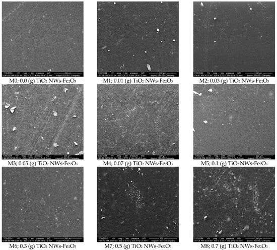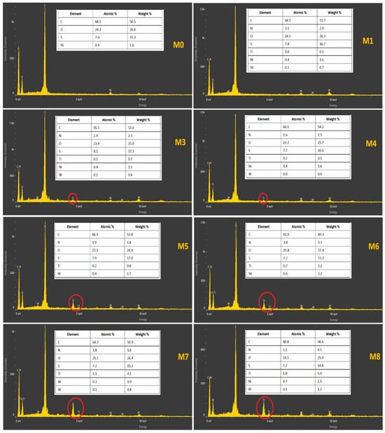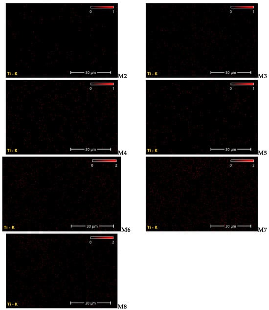 The analysis of EDX was rather necessary for confirming that the elements exist in the matrix of the nanocomposite membrane. Therefore, the fabricated membranes by the current method were tested for the existence of the components of TiO2 NWs/Fe2O3. Figure 8 depicts the EDX images of the PES-TiO2 NWs/Fe2O3 membranes fabricated from different TiO2 NWs/Fe2O3 contents of the casting solution. The corresponding TiO2 element mappings confirmed scattering of TiO2 NWs/Fe2O3 among the entire membrane, as depicted in Figure 9. It can be noticed that the uniform dispersion of the TiO2 NWs/Fe2O3 in the membrane was observed with a loading of 0.5 g of the TiO2 NWs/Fe2O3. The clear observation in Figure 9 (M7) is of very slight agglomerations of TiO2 NWs/Fe2O3 in the matrix of the membrane with increasing TiO2 NWs/Fe2O3 contents in the PES casting solution. This observation is due to the homogeneity of the PES solution and excellent dispersion of TiO2 NWs/Fe2O3 in PES solution from utilizing the ultrasonic apparatus.