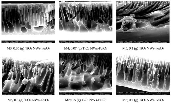 Figure 5 and Figure 6 depicted the surface and cross-sectional morphologies of the membranes synthesized in the study. As displayed in Figure 5, both the TiO2 NWs-Fe2O3-PES nanocomposite membranes and the pristine PES membranes exhibit a smooth active layer, which is a typical surface characteristic of PES membranes, with no noticeable aggregates witnessed at low nanostructure content. However, with the incorporation of higher concentrations of TiO2 NWs-Fe2O3 nanostructures (≥0.3 g) into the casting solution, visible aggregates begin to appear on the membrane surface, especially at the 0.7 g loading content. These aggregates likely migrated to the surface during the phase separation process due to the higher loading content of nanostructures.
