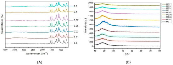 The Fourier-transform infrared spectra (FTIR) is a highly prominent technique for identifying diverse functional groups on membrane surfaces and analyzing their potential molecular chemical bonds. Figure 7A showcases the FTIR spectra of the pristine PES membrane and the TiO2 NWs-Fe2O3 modified PES nanocomposite membrane, covering a range from 500 to 4000 cm−1. The FTIR spectrum confirms the chemical structure of the PES membrane, with several notable peaks observed at 1099 cm−1, 1148 cm−1, 1240 cm−1, 1337 cm−1, 1485 cm−1, and 1578 cm−1. These peaks correspond to C–O stretching, symmetric O=S=O stretching, aromatic ether, asymmetric O=S=O stretching, C=C stretching, and the benzene ring, respectively. The main characteristic peak of the PES membrane (M0) are those detected at 1485 cm−1 and 1578 cm−1. Interestingly, the TiO2 NWs-Fe2O3 nanostructure peaks were not observed in the FTIR spectra of all the nanocomposite membranes (M1 to M8), despite being visible in SEM images. This is likely due to the low concentration of nano-additives in the polymer matrix, where the polymer likely encapsulated the nanostructures. Similar observations have been reported by previous studies [].