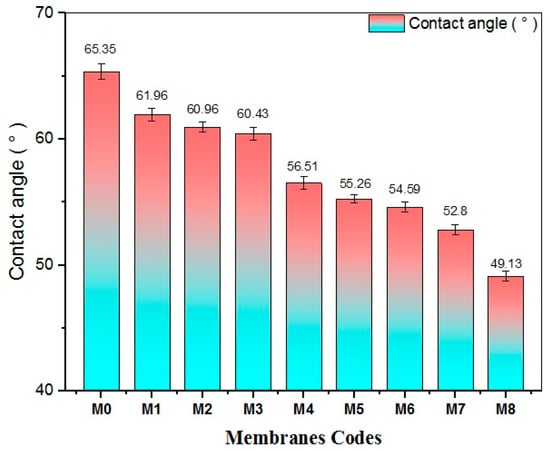Contact angle (CA) measurements are a useful method for evaluating membrane hydrophilicity and drawing connections to membrane performance. Figure 10 presents the CA values of membranes prepared with varying amounts of TiO2 NWs-Fe2O3. The pristine PES membrane displayed the highest CA of 65.35°, compared to the lower CA value measured for the different nanocomposite membranes. Overall, the incorporation of TiO2 NWs-Fe2O3 into the casting solution improved the hydrophilicity of the PES membranes, with the CA changing based on the amount of TiO2 NWsFe2O3 added. As the nanostructure content increased, the CA of the nanocomposite membranes decreased, showing improved hydrophilicity, and reaching the minimal value of 49.13° for the M8 membrane, which was prepared with 0.7 g of nanostructure. Meanwhile, although some nanoaggregates have been observed at the surface of the M8 membrane, the hydrophilicity characteristics are still better than other modified membranes. This confirms that the hydrophilic nature of TiO2 NWs/Fe2O3 was successfully imparted to the fabricated membranes surface.