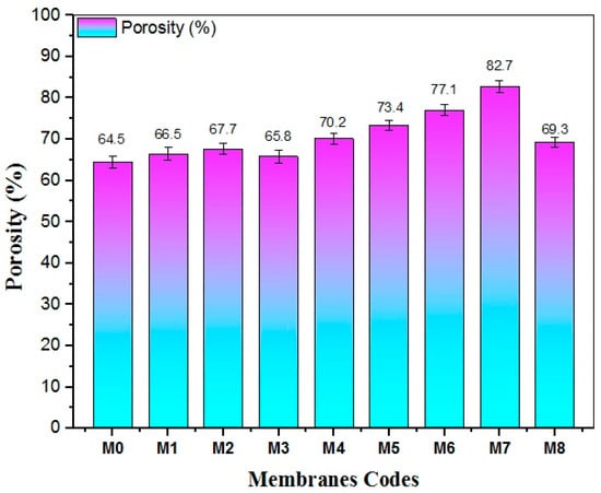 Porosity plays a crucial impact in determining the performance of membranes. Figure 11 displayed the porosity measurements of both pristine PES and modified nanocomposite membranes. The pristine PES membrane exhibited the lowest porosity value compared to other nanocomposite membranes. Herein, as the concentration of TiO2 NWs-Fe2O3 increased, the porosity of the membranes also increased, reaching a peak value of 82.7% at 0.5 g of nanostructure. However, with the further impregnation of nanomaterials, the porosity began to diminish, dropping to 69.3% for the M8 nanocomposite membrane, which has been prepared with 0.7 g of nanostructure. Despite this decline, the porosity of M8 was still higher than that of the pristine PES membrane, which revealed a porosity value of 64.5%.