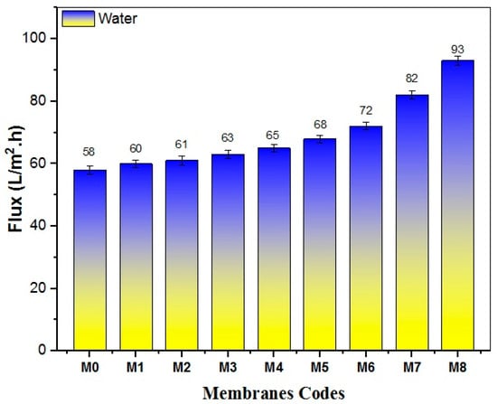 Figure 12 illustrates the pure water flux (PWF) of both pristine PES membranes and the nanocomposite membranes incorporating disparate amounts of TiO2 NWs-Fe2O3. A clear trend of improved permeability is witnessed across all nanocomposite membranes as the nanostructure content increases. Comparing to the control PES membrane which revealed the lowest PWF, the incorporation of a small amount (0.01 g) of TiO2 NWs-Fe2O3 into the polymer matrix resulted in a noticeable increase in permeability, reaching 60 L/m2·h. Notably, the nanocomposite membrane with 0.7 g of TiO2 NWs-Fe2O3 (M8) demonstrated the highest PWF, rising from 58 L/m2·h in the unmodified PES membrane (M0) to 93 L/m2·h. This significant improvement in flux can be ascribed to the concurrent enhancement in surface features of the nanocomposite membranes, mainly increased hydrophilicity and porosity.