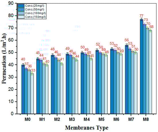 An NBB dye solute permeation test was also performed using four solute concentrations (25, 50, 100, and 150 mg/L) as shown in Figure 13. The flux of all membranes declined by almost one third of its flux when filtrating 25 mg/L NBB. Similarly, increasing the NBB feed solution concentration caused further decline in the solute permeate flux. This further decline is associated with the higher compacted layer of dye molecules at the surface of the membranes forming additional resistance to the flux passage.