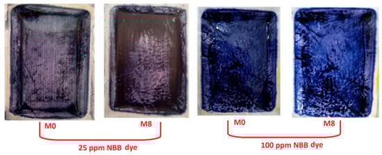 Notably, all nanocomposite membranes (M1 to M8) showed nearly complete retention of NBB dye compared to M0 membrane. This enhanced retention can be attributed to enhanced hydrophilic nature and structural change induced by the nanostructures impregnated into the polymeric matrix. Besides that, the rapid fouling behavior at the initial stage of filtration, particularly at higher dye concentrations, could also contribute in all membrane sample retention potentials. Since the NBB dye molecules are much smaller than the average pore size of the membranes, they easily infiltrated the pores, leading to swift clogging. This process resulted in the formation of a “cake layer” on the surface of the membranes, as seen in Figure 15. The cake layer effectively functioned as a barrier, preventing further dye molecules from passing through the membrane. As a result, this layer significantly contributed to the high retention efficiency observed in the nanocomposite membranes.