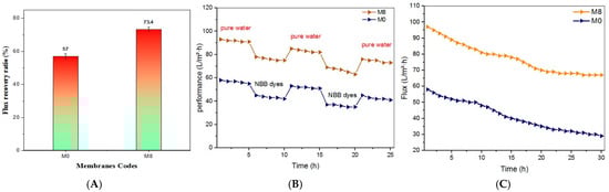 (A) The flux recovery ratio of M0 and M8, for 100 mg/L NBB dye solution. (B) Time-dependent flux of pure water and NBB dye solution for M0 and M8 membranes. (C) Stability operation for M0 and M8 membranes.