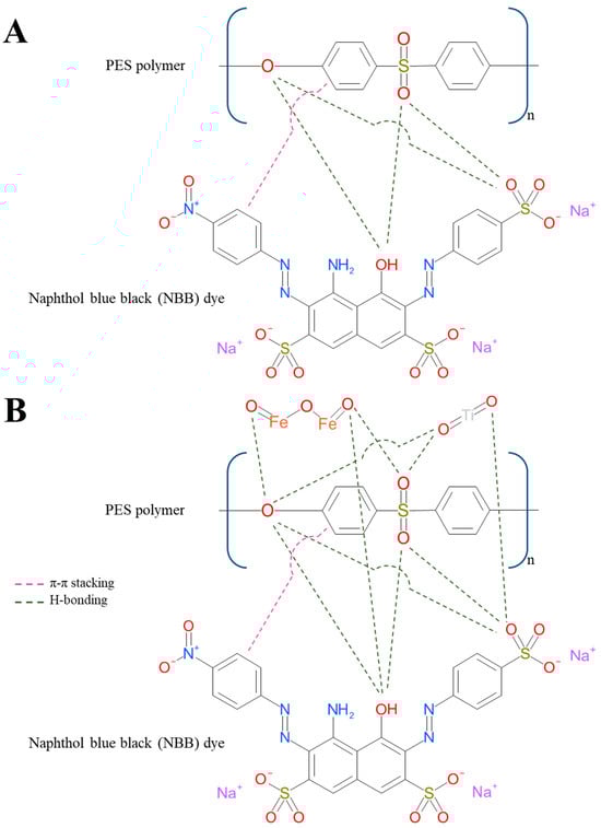Important information about dye removal from water can be obtained by carefully examining the interaction and transport mechanisms of PES and TiO2 NWs-Fe2O3 PES membranes. As seen in Figure 17A, the PES polymer chain links with NBB dye via H-bonding, electrostatic interactions, and π-π stacking. As such, sulfone (-SO2-) and ether (-O-) groups found in PES can receive H-bonds. PES and NBB can interact more easily because of the hydroxyl (-OH) and sulfonic acid (-SO3H) groups in NBB, which can donate H-bonds. Moreover, because of its -SO3− groups, which can interact with positively charged sites on PES, NBB is an anionic dye; however, because PES is typically neutral and hydrophobic, these interactions are weak. Aromatic rings found in both PES and NBB have the potential to cause π-π stacking interactions. In dye separation procedures, these interactions are important. As was covered in previous sections, the hydrophilicity and porosity of the membrane have a major impact on dye rejection. These elements efficiently inhibit dye molecules while facilitating the transit of water molecules. Also, the TiO2 NWs-Fe2O3 PES nanocomposite links with NBB dye via H-bonding, electrostatic interactions, and π-π stacking, as shown in Figure 17B. The -OH and -SO3H groups of NBB can form H-bonds with PES (-SO2- and -O-), TiO2 (-OH groups on surface), and Fe2O3 (-OH groups on surface). When it comes to dye adsorption on the nanocomposite membrane, this is crucial.