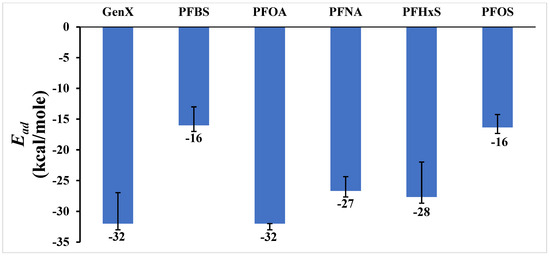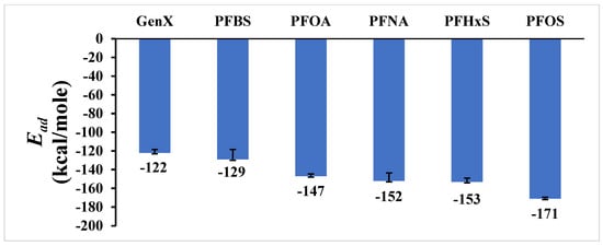 Ead is defined as the sum of the electrostatic and van der Waals interactions between the molecules (specifically, between the PFAS and graphene) throughout the simulation and averaged over each step. Also, it refers to the binding affinity of one molecule to another. The trajectories and the energy components of the systems were obtained and analyzed every 100 ps over the last 500 ps to calculate the various interaction energies using Equation (1) [