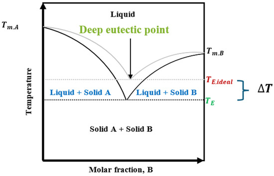 A general solid–liquid equilibrium (SLE) of a simple ideal eutectic mixture and a deep eutectic mixture. and represent the melting temperatures of compound A and B, stands for the freezing point depression [13].